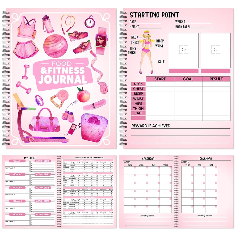 - Careful Design: our workout log notebook is designed with eye-catching cover, printed with some attractive elements, such as fitness clothes, gym bags, treadmills, barbells, scales, skipping ropes, etc, vivid and cute, filling you with the desire to keep fit; The inner page design also contains rich content, including my goals, foods calorie counter, calendars, full body workout, fat-burning guidance, track your progress page and so on, carefully create a week food and fitness plan for you