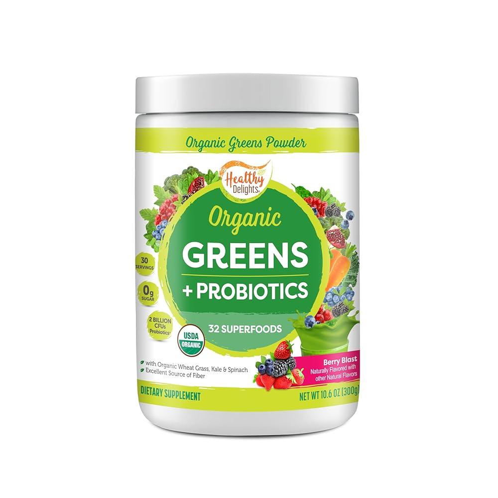 • Healthy Delights Organic Greens + Probiotics provides a powerfully delicious spectrum of vegetables including kale, wheat grass, beets and more for your everyday intake