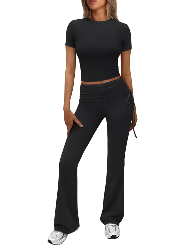 - Design: Crew neckline, short sleeve, low-rise fit, slim fitting, folded waistband with adjustable side ruching, slight flared leg. ideal for all-day wear.